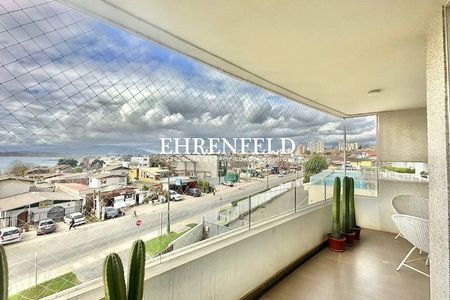 Departamento de 3 dormitorios y 2 baños (uno de ellos en suite), cocina americana y equipada, living comedor con salida a una amplia terraza abierta con malla y vista increíble a la bahía de Reñaca.